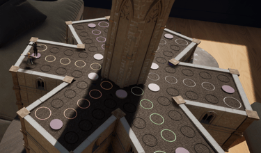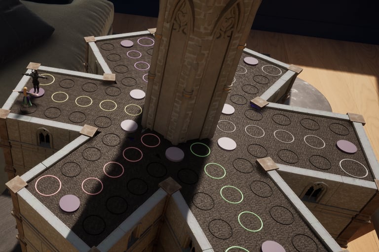 The flat circular board became a vertical, modular tower. Each completed level adds a new floor. The game physically grows alongside the progress of the campaign.
